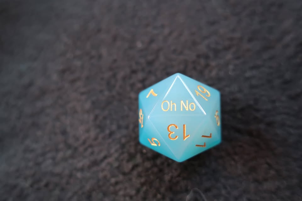 D20 – Gemstone White Opal with special crit hit/fail text (“Yeet” / “F**k”) ($15)