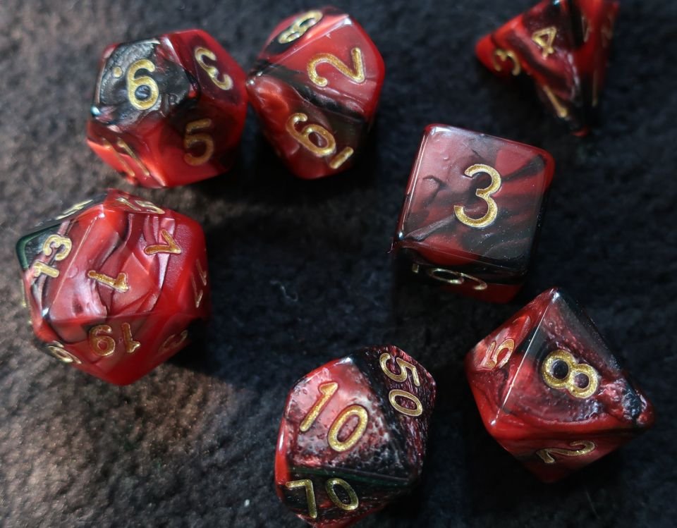 7 Dice Set – Acrylic Dragon Blood ($8)