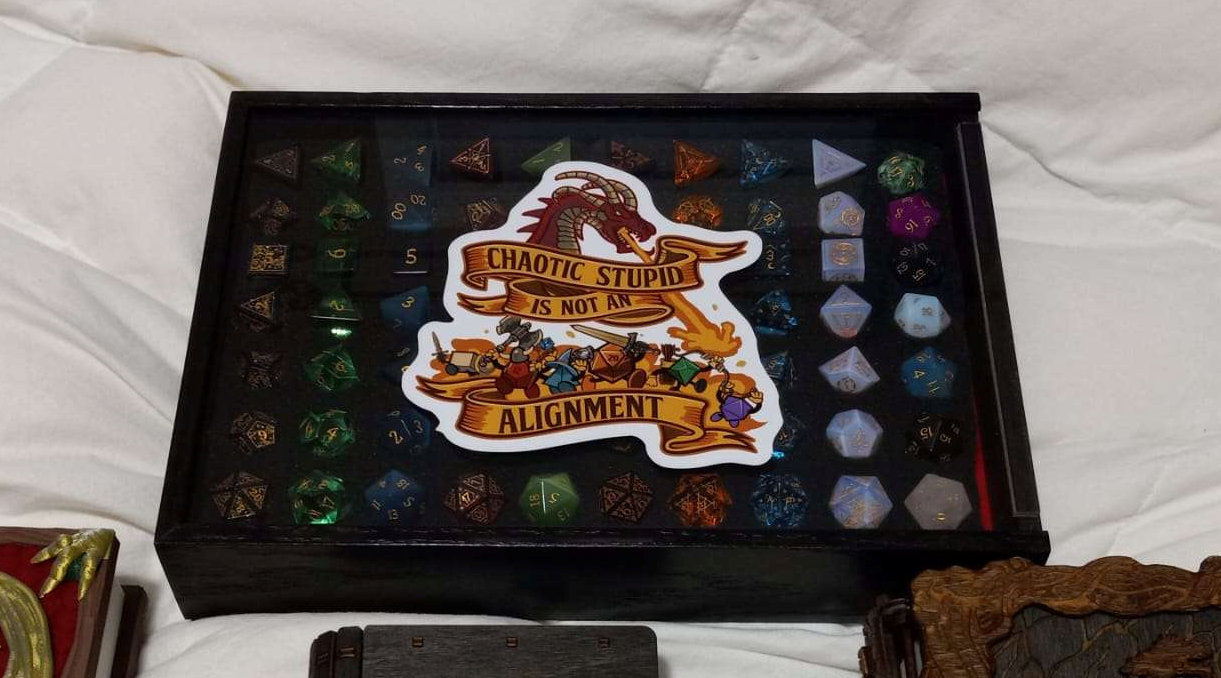 This is a fantastic makeshift gemstone dice holder/display box. I had the wooden box (ebony stain, red felt lining, internal dimensions 8″ x 11.5″ x 1.25″) and sliding acrylic cover custom made, then added the foam with dice cutouts to accommodate 10 D&D dice sets (70 dice total) plus the…