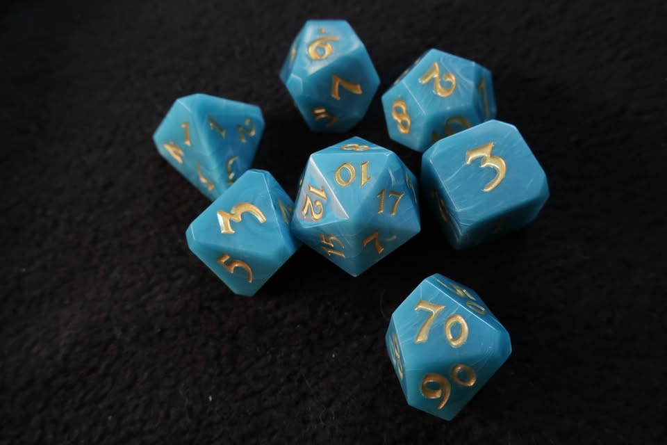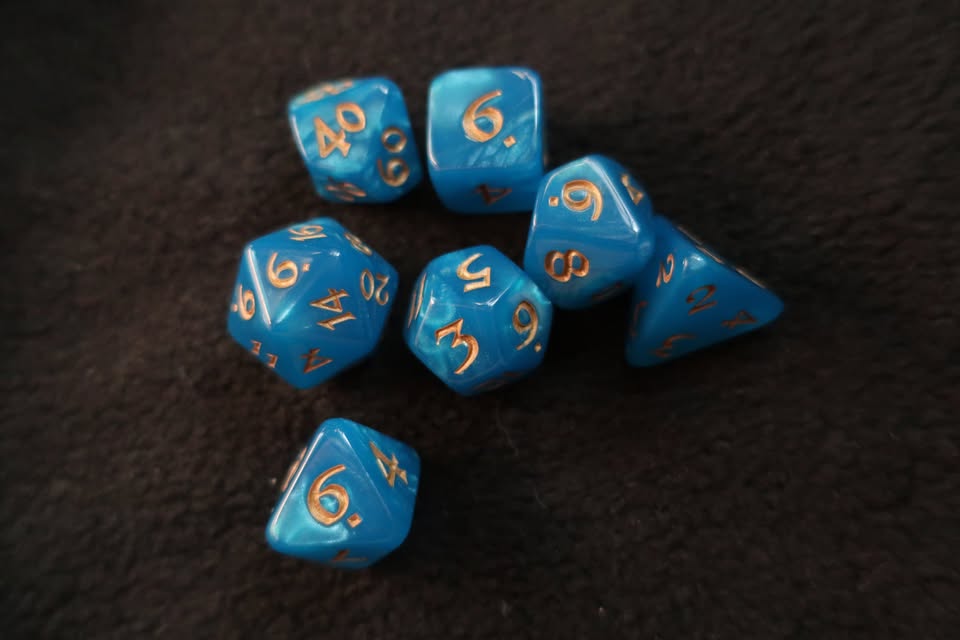 7 Dice Set – Acrylic Opalescent Ocean Blue and Gold ($10)