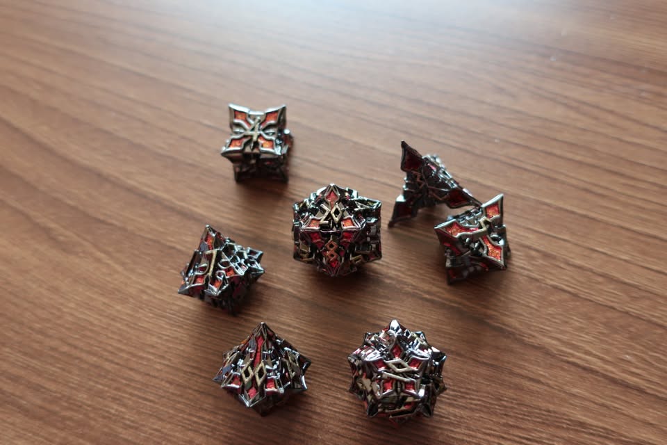 These are small but heavier, sharp little dice with an awesome demogorgon theme. Great for dark characters, but make sure you use a felt-lined dice tray or good dice mat so they don’t scratch anything up!