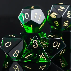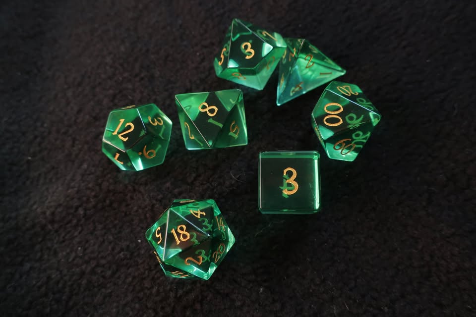 7 Dice Set – Gemstone Green Agate Unicorn (D4, D8, D10, D12, D20, D%) + Gemstone Green Cat’s Eye D6 ($65)