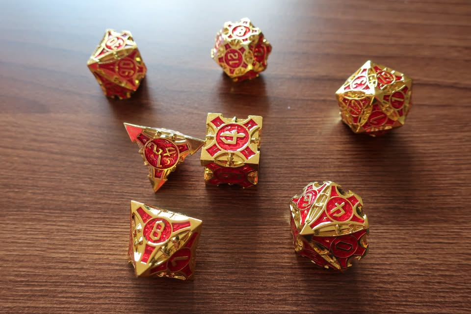 These are small dice but solid metal and therefore heavy. They roll wonderfully with a satisfying clunk, but be sure to use a dice mat or felt-lined tray so they don’t chip anything!