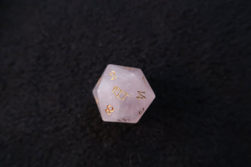 D20 – Gemstone Pink Opal with special crit hit/fail text (“Yeet” / “F**k”) ($12)