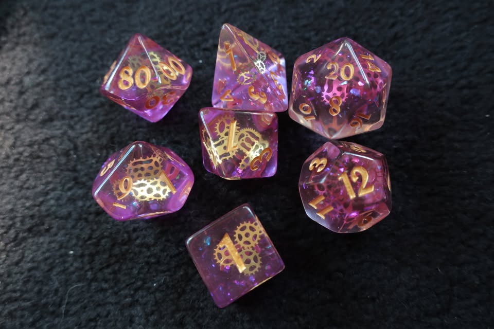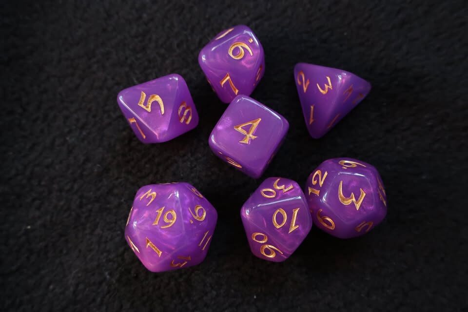 7 Dice Set – Acrylic Opalescent Purple and Gold ($12)