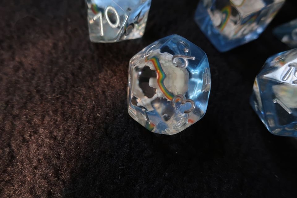 Super sharp dice, very cleanly cut and with a great snow and ice crystal effect inside. These are also on the larger side and ideal if you’re looking for chunkier but lightweight dice to throw.