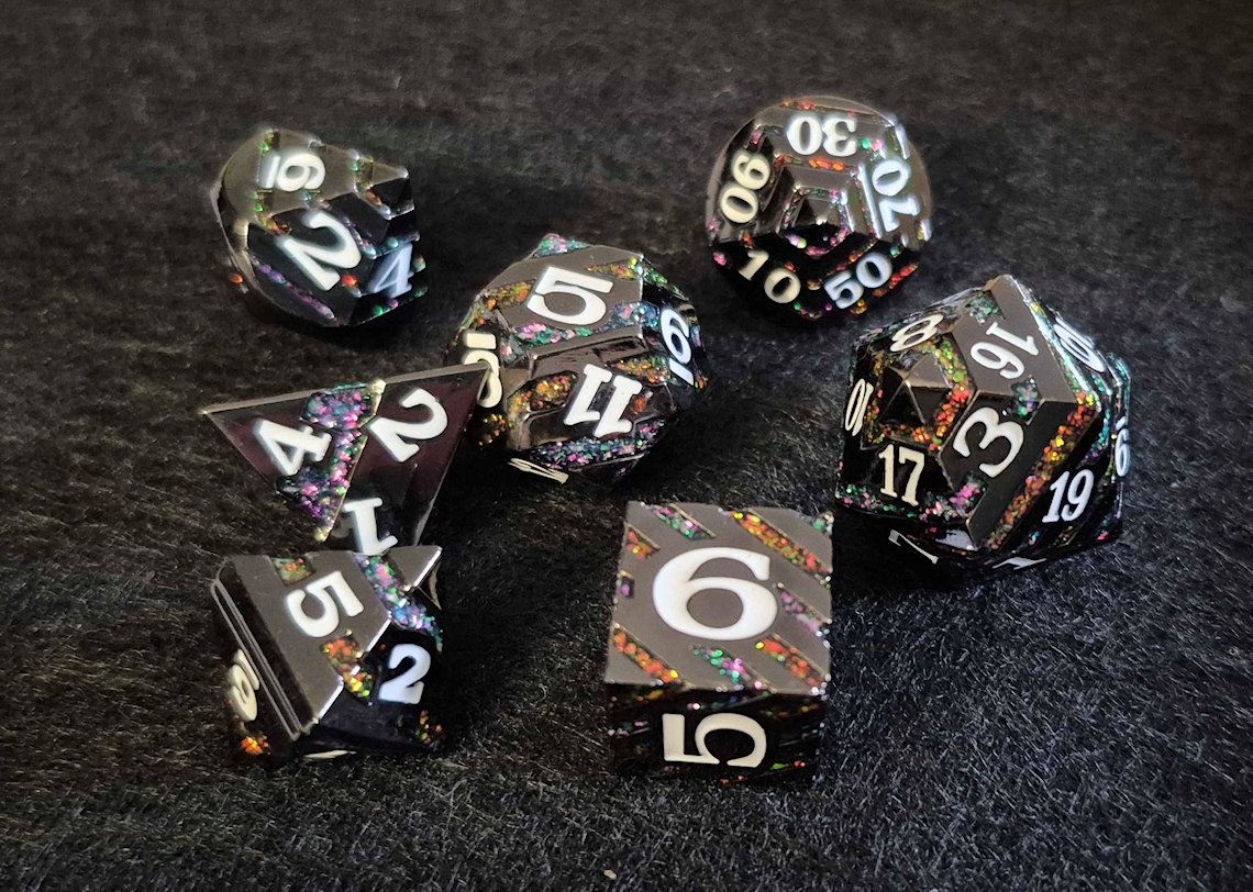 7 Dice Set – Black Metal with Rainbow Stripes ($35)