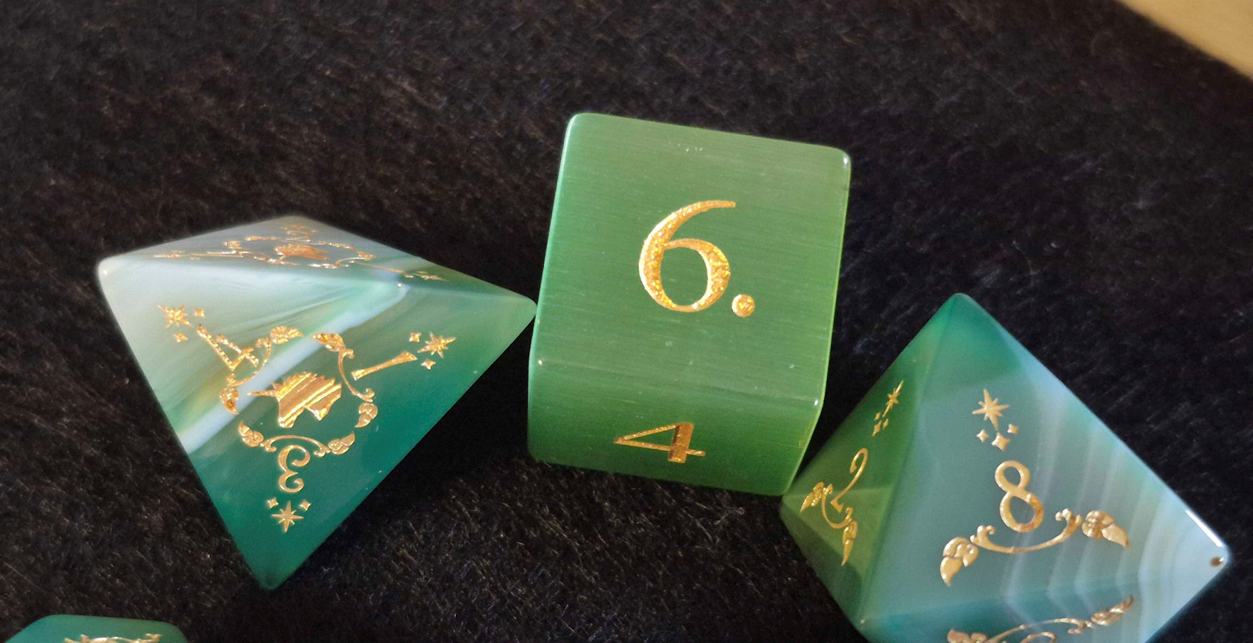 These are beautiful gemstone dice that feel great to roll and look fantastic, especially for a fae character. It’s a unicorn themed set on green agate except for the D6, which is solid cat’s eye.